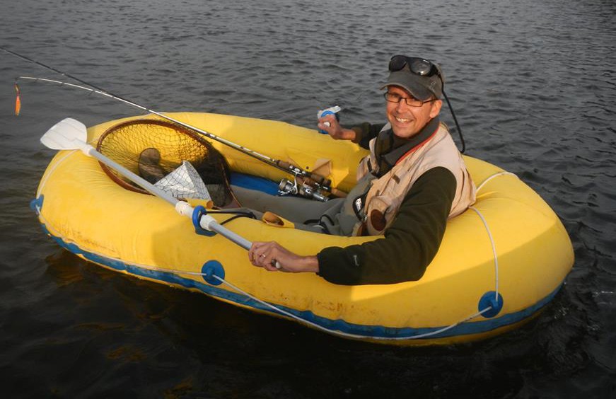 Ved ankomsten til vandet havde Jari hurtigt 50% af vores samlede gummiflåde klargjort. Op af sin rygsæk trak han nemlig en fed gummikajak, som var pumpet og klar på minustid…. Jeg selv var via en mini-elpumpe og bilens 12 voltsstik også overraskende hurtig klar, og med mit retrogule gummi-lyn, var den lidet imponerende fiskeflåde komplet 🙂