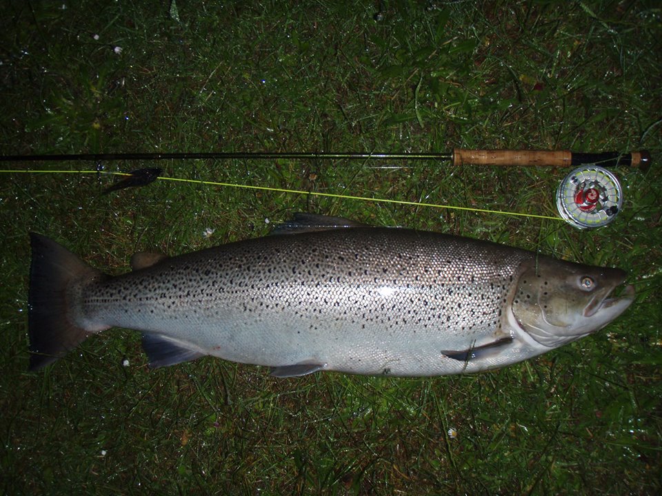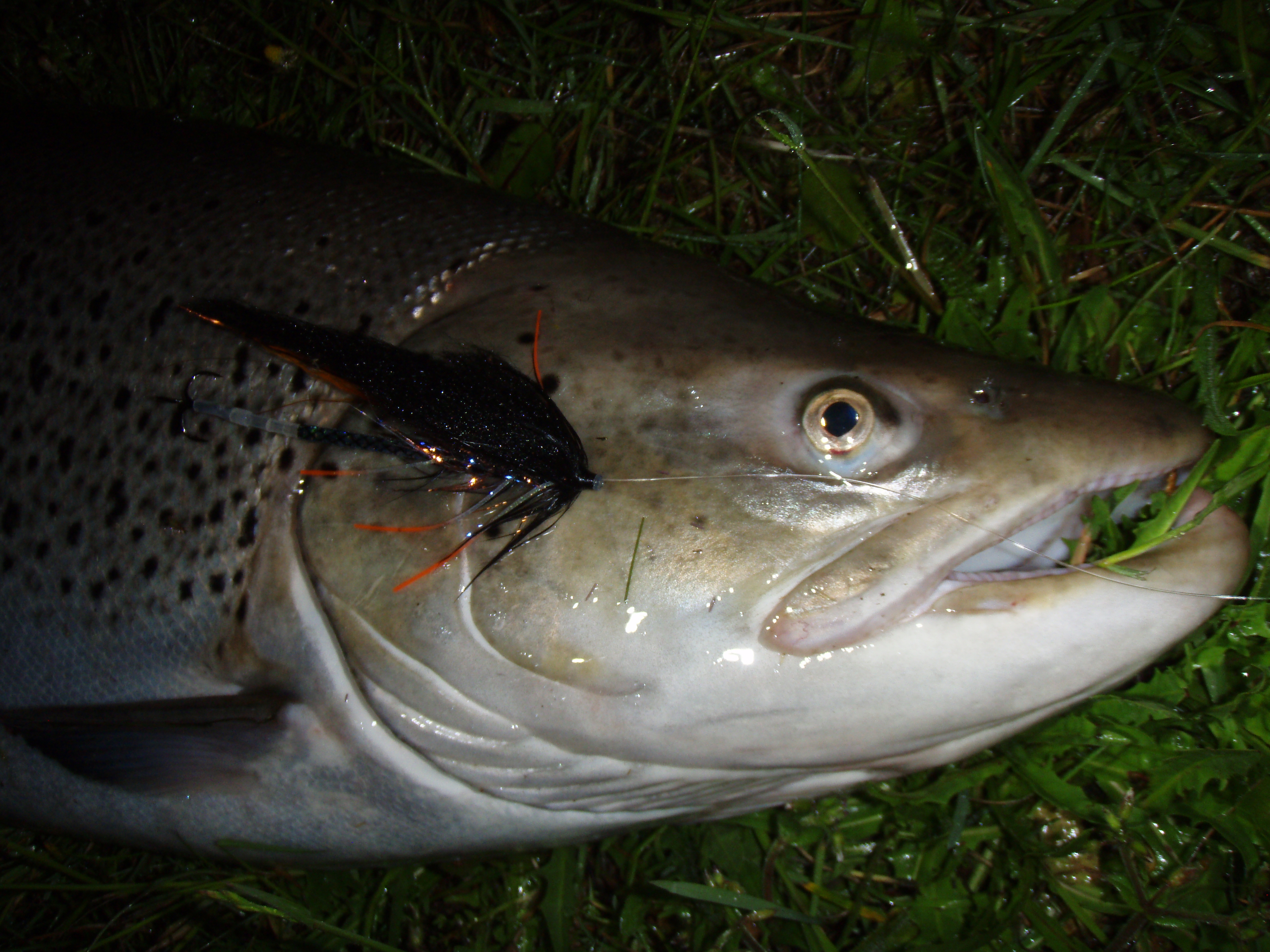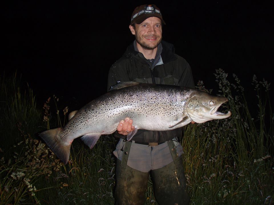 Allans flue kaldet “Blæksprutten” blev taget hårdt i det natmørke vand, og enhånds-syveren blev sat under pres, men efter et kvarters intens fight og en 50 meters vandring ned ad åbrinken, blev det 11 kilo tunge og 92,0 centimeter lange havørred-“beast” dirigeret sikkert i nettet. Sådan skal det gøres! – Rutine fornægter sig ikke…