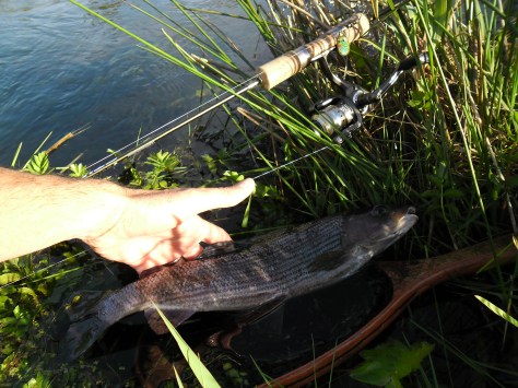 Og den gav aftenens eneste stalling på land (plus et par standard-bækørreder), – men jeg havde flere tunge hug, og desuden en del nysgerrige mellemklassefisk som fulgte sultent med , når den lille grønne snurre-fidus daskede forbi deres spidse “snuder” 🙂