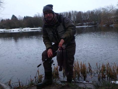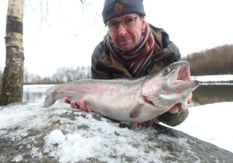 Efter en stabil fight endte en yderst præsentabel 3-kilos på 60 fine centimeter i nettet. – Perfekt afrunding på en halvkølig tur med gråvejr, +1 grad og et par hidsige snebyger… Så er vi i gang! 🙂