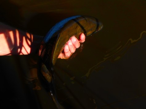 Jeg fandt en skyggefuld plads – yderst tiltrængt efter Nord og Øst-lokationernes heftige solskin. – Og så lige en kølig pilsner til at hygge med – medefiskeri er sgu nice! Jeg forfodrede med en stak majs og fandt faktisk ud af, at den bekedne vandstand og enkelt solstrejf gjorde det mulig at se hvilke fisk der cruisede rundt. – Og snart var der godt med Gråskaller, som mæskede sig i mine majs. Det fik mig til at koncentrere mig om den kolde øl, og jeg afventede egentligt bare, om der kom noget mere spændende ind på foderpladsen…..