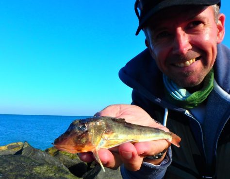 Efter en halv time i zen-mode – bare nydende hvordan havet og stranden vågnede – var det tid til at indtage en af stenmolerne, og kort efter var det lille tobislignende blink sendt ud mod det engelske… – Med en ultratynd 0,08’er-line kan der opnås en del ekstra distance som kompensation for de lette endeagn.