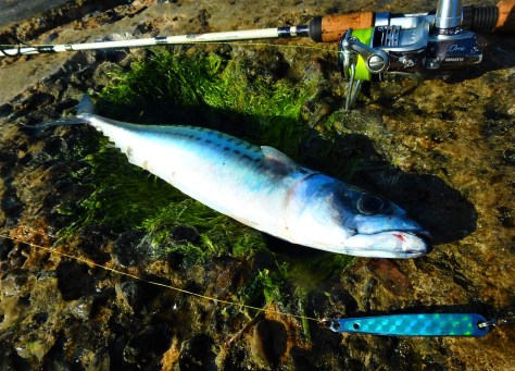 Trods østenvinden og de vedvarende meldinger om makrelfangster, var der ikke meget tegn på at bolværkstunene var i området. Sgu ærgerligt når et de store UL-ønsker er at fighte en makrel i badebukser direkte fra stranden. – Og den mulighed får man ikke mange gange på en sæson… – Bedst som jeg står på molen og surmuler lidt over nitten i makrellotteriet, knalder der sgu en strejfer på yderst i kastet – og så var der fight for alle pengern’ 🙂