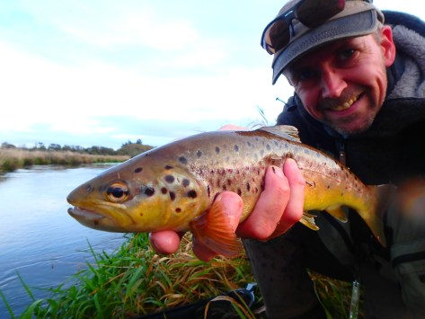 – Kunne det virkeligt tænkes at den sikre 4,5 gram kobberspinner havde mistet sin magi for en stund? – Afløseren lå øverst i æsken: En lille str. 1 signalgul Vibrax med røde prikker på bladet, – nu skulle de flabede fyre sgu provokeres! – Og det lykkedes fint, da først en +40’er fejlhuggede efter et vildt angrebsraid fra modsatte brink, og derefter en endnu bedre fisk huggede kontant!… – Og blev siddende. – Sur i låget – det tror jeg da lige,! – og slet ikke tilfreds med at blive afbrudt i scorings-forberedelserne :-). Den fik i hver tilfælde brugt den godt fyldte å’s ekstra 10 centimeter vandstand bedst muligt. Men efter at den havde raset af, fik jeg den i nettet og kunne efter en respektfuld beundring snuppe et hurtigt selvudløserskud. Herefter var det farvel med tobak for en fin 2019-sæson….