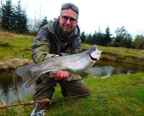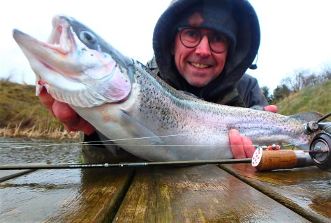 Næste stop blev ved altid sikre Ox River, som hos undertegnede kandiderer til danmarks mest spændende ørredpark. Som vanligt startede jeg med at drible deres fede å-løb igennem, og det gav – ud over en tabt fisk og to hug – denne herlige regnbueørred på land: