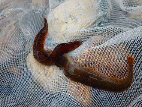 Peter startede med at køre sin geniale rejehov rundt i vegetationen på lave vand, for at skaffe guf til bombardafiskeriet, – og det er altid spændende at se hvad det ender i nettet 🙂