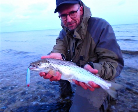 Peter fik sine “truttere” på en rejeflue, mens de to jeg fik på land tog hhv en gummireje-ophænger og et klassisk grøn/sølv Hansen Fight med efterhængt trekrog str. 10. – Vi havde en perlerække af hug – også fra havørreder, som vi tilmed også så jage i overfladen. Fedt!