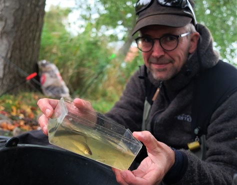– Båndgrundlingen har invaderet en del søer, især i det østjyske hvor den er en hård konkurrent til vore danske arter. Kasper foretager jævnligt fiskeundersøgelser i nogle af disse søer, så selv om den pågældende sø var en “no-go”-sø havde vi kommunens “velsignelse” til at fiske i den. – Og det er især netop Båndgrundlingen, som følges med alvorlig mine, – meget fikst når den nu stod på listen over mine manglende UL-arter…. – Mon ikke jeg kunne få den “i kassen”?… 🙂