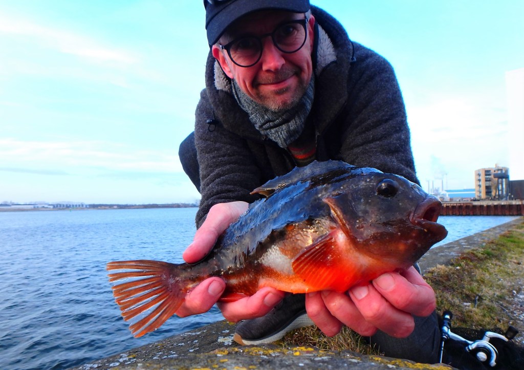 – Jo da – den smukke fisk boblede stadig rundt, så jeg firede godbidden en meter ned – lige i øjenhøjde. Duften fra regnormen ramte hurtigt stenbiderens snude, hvorefter den stillede sig lodret i vandet lige under ormestykket, svømmede op og hapsede! – Modhug, kort fight og hurtigt i nettet – min første Stenbider var på land 🙂