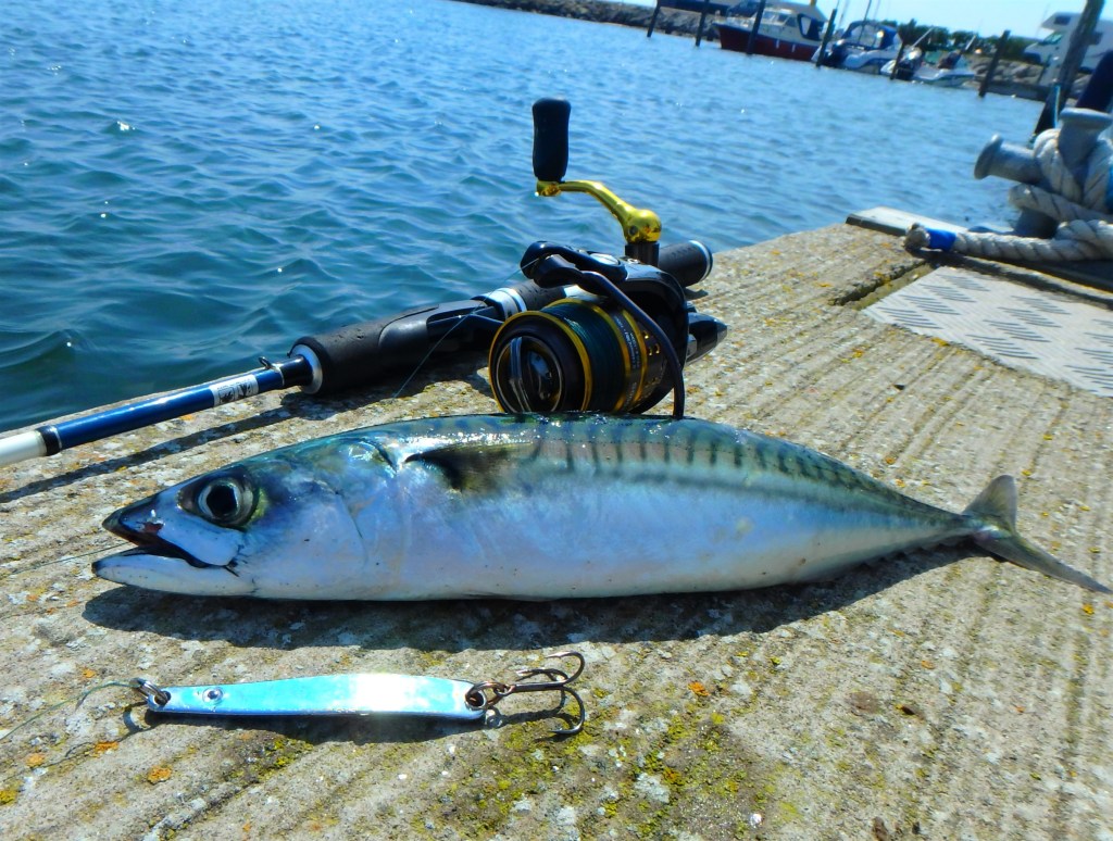 – Jeg kom lige forbi et havnebassin, hvor der var en del uro i overfladen. Små fisk blev jævnligt jagtet op rundt omkring bådebroerne, og med jagt-hastighed måtte det næsten være makreller. – Så jeg greb en af pindene i bagagerummet og tyrede et sølv/lyseblåt no-name-blink ud i havnens dybeste parti. – Første kast gav et markant hug, mens andet kast gav fast fisk. – Som altid var det en forrygende fight leveret af den spændstige fisk i midt-trediverne. Makrellen er så’n cirka den perfekt fisk til UL-gearet!