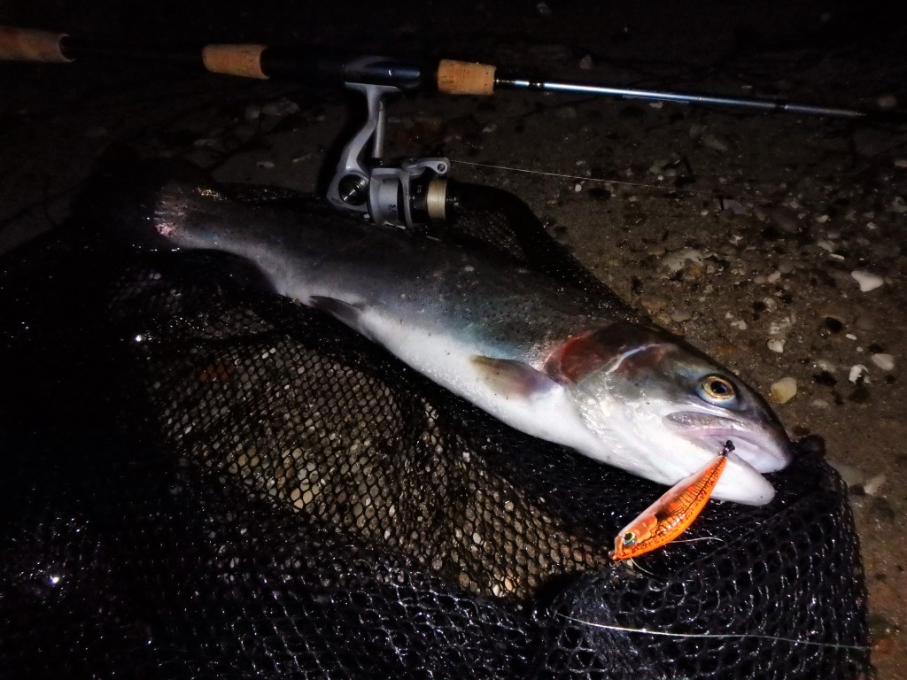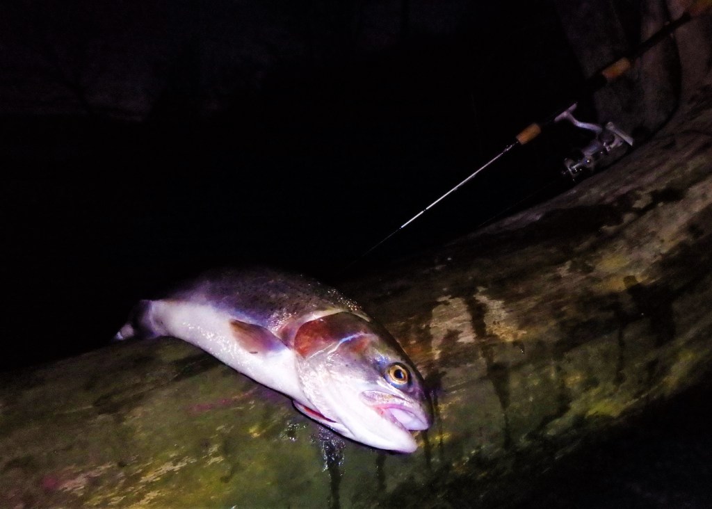 Lyset var for alvor ved at forsvinde, og jeg havde ikke de store forhåbninger om, at regnbuerne ville hugge i mørket. – Så der var lige ekstra koncentration på, da jeg lagde yderligere et kast tæt op af et af de utallige væltede træer. – Mens jeg spinner ind ser jeg en rygfinne bryde overflade en god håndfuld meter ude, og til mit held var indspinnings-retningen lige ind i “danger-zone”. – Og så blev ellers hugget igennem!! – Forrygende fight mellem de mange udfordringer, og jeg måtte lige træde et godt stykke længere ud forbi træernes grenspidser, for at kunne nette fisken. – Fedt – min første UL-regnbue på kysten var landet 🙂