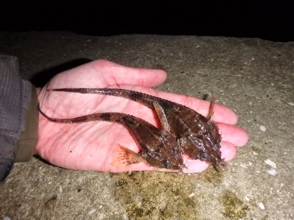 Jeg var dog ikke helt færdig, og “natten var ung”…. – Spottet blev skiftet, og så fulgte der en begivenhedsrig sidste time! Først fandt jeg lige præcis hvad jeg savnede på årslisten: En Ålekvabbe!. – På min seneste tur lykkedes det makker Peter at lande en af de lange hyl (læs evt. JULEFROKOST-TUR… ), mens jeg desværre ikke spottede nogle. Men nu var chancer der – “kvabsen” som huggede rejen prompte og endte kort efter i akvariet, hvor jeg målte den til 16,6 centimeter. – Total tilfredshed med at få årets UL-art nr. 69 i hus. – Og sandelig om ikke jeg ramte yderligere to ålekvabber – den første røg også i akvariet, mens jeg bommede på nummer to, som længdemæssigt lå helt oppe omkring de 25 centimer! – Æv – aftenens tredje PR slap krogholdet lige ved kanten af vinduet 😦