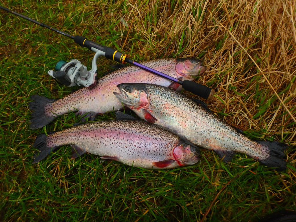 En fin test af ny pind nummer 2, – den spiller sgu max :-). – Testuren med den første nyindkøbte rejsepind kan i øvrigt læses her: “FIRE PÆNE PUTTERE“. Og der var flere gode fights i vente til det nye “lilla lyn”, da tre forslugne regnbueørreder også ville lege med. – Dermed endte jeg igen med 4 styk på land, som ved min nylige tur i Ox River. – Jeg var dog egentligt mest interesseret i Bøvling-søernes guldørreder, men dem så jeg desværre ikke rigtig nogle af :-).