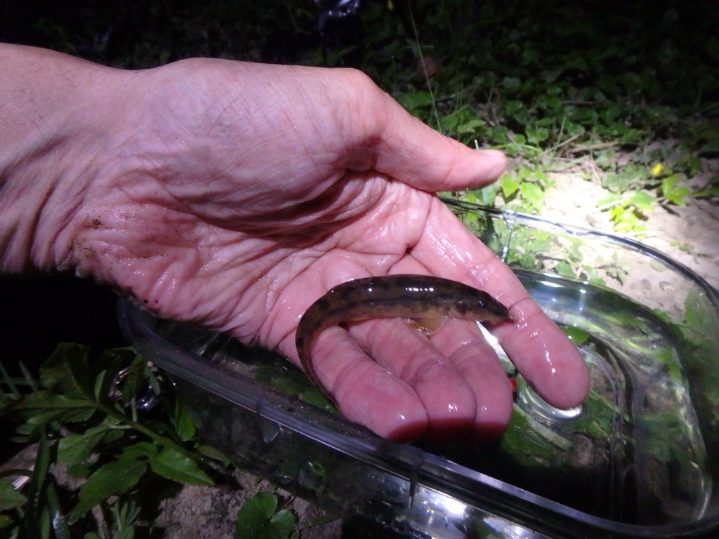 Med pandelampen tændt havde jeg ikke scannet den grusede bund længe, før jeg spottede den første! – Fedt – så var spottet altså helt rigtigt! – Jeg havde læst at smerlingen er en yderst lyssky fyr, og det var sgu ikk’ lyv! – Shiiiit de er generte… – Jeg fandt hurtigt endnu et offer og skruede gevaldigt ned for lysstyrken, servede mit tanagoguf (læs evt. om Tanagoerne her: TANAGO-KROGE) og sandelig om ikke den hapsede med det samme – JA TAK!