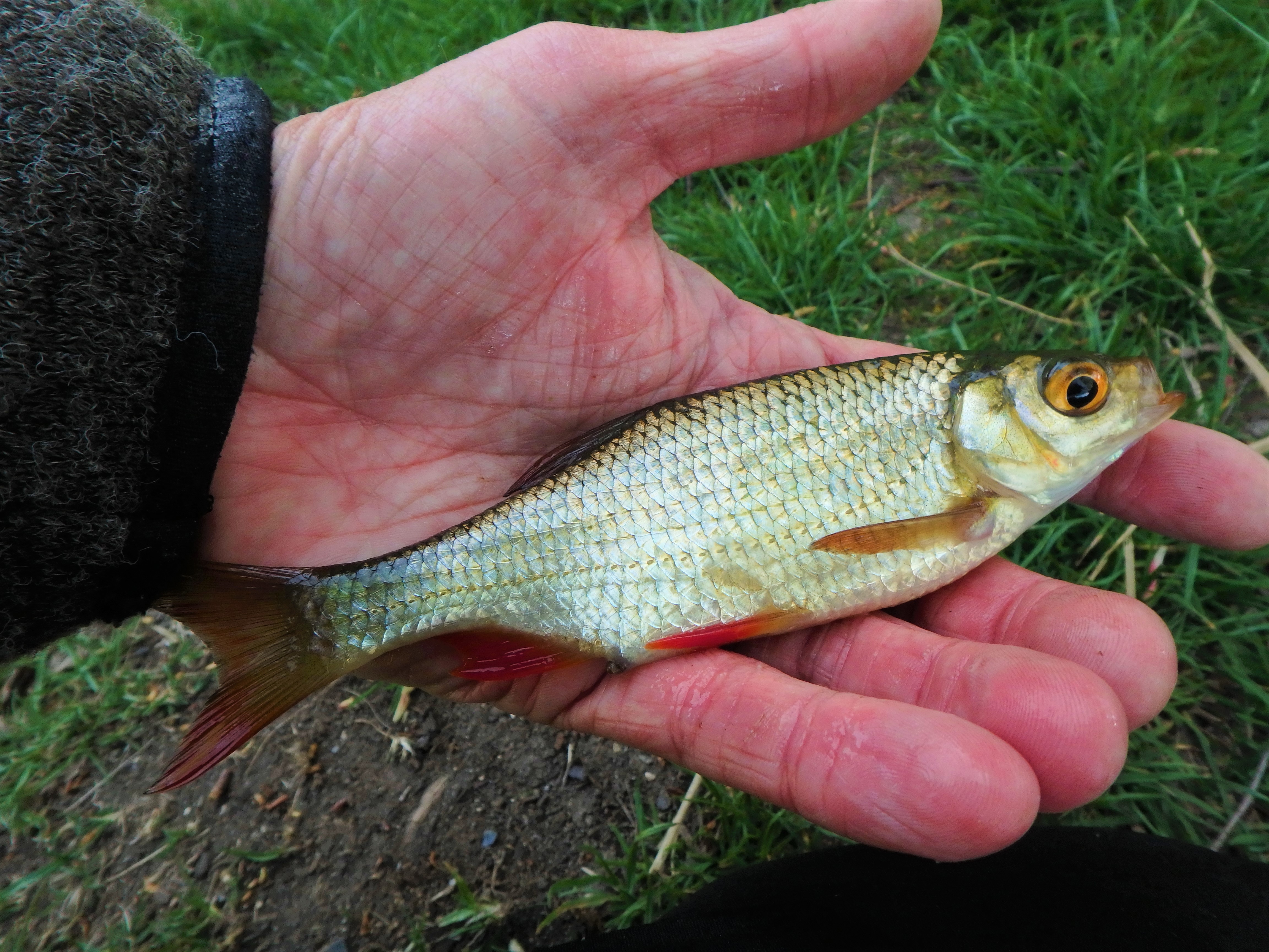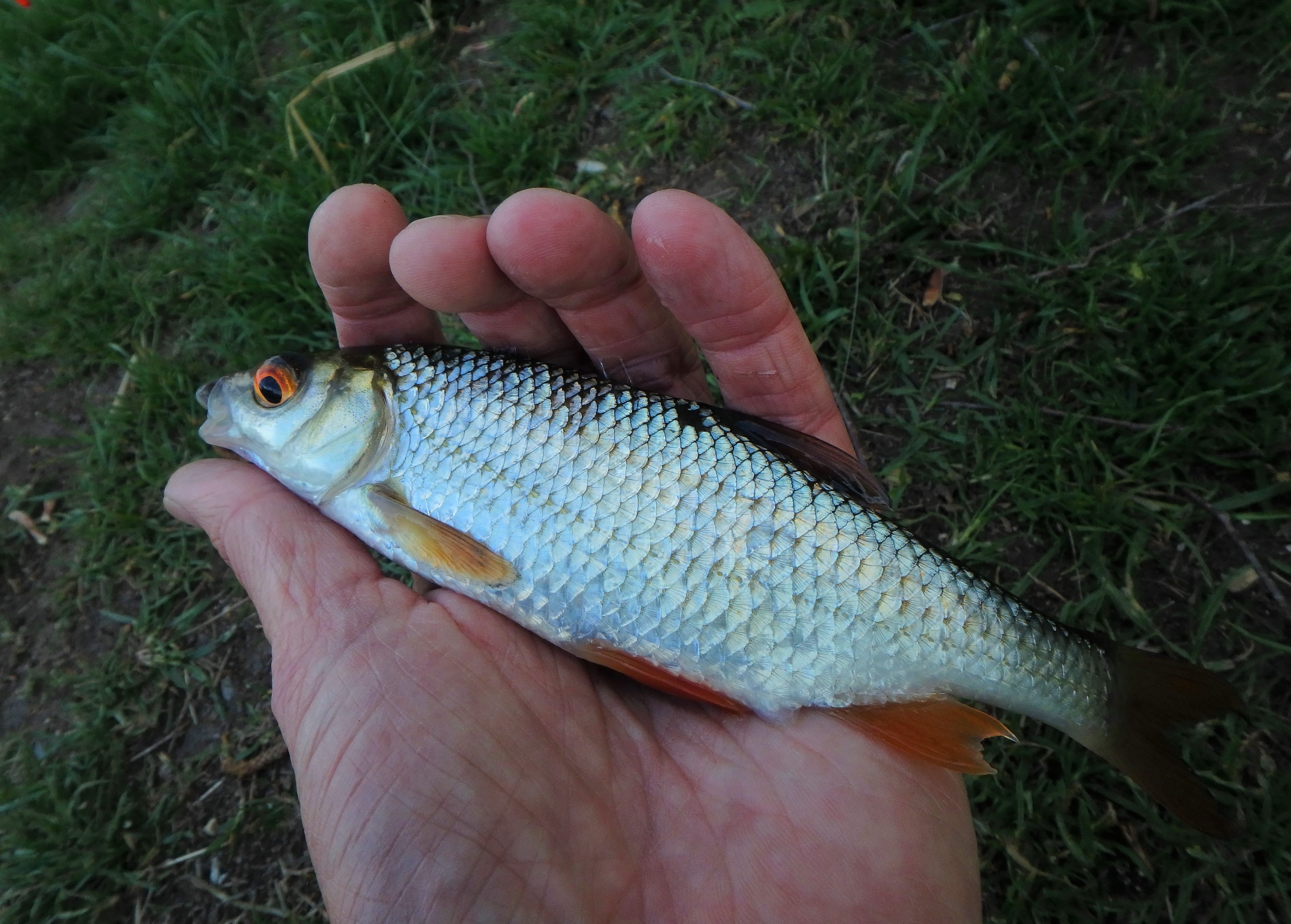 Det var masser af regnbueørreder og guldørreder i søen som cruisede rundt, og ind imellem også fulgte vore agn, men desværre så vi slet ikke noget til Solskinsbarsen. Mens vi ølhyggede lidt – det var jo “lille-fredag” – søsatte vi lidt orm og majs. Søen skulle også holde sudere, men idet den oftest er en morgen- og aftenaktiv art, var forhåbningerne ikke store med kun to timers fisketid, og vi fandt da heller ikke “doktorfisken”. – Til gengæld var der godt med liv i både Gråskaller og Rudskaller. – Med Peters flotte guldklump på topbilledet som den fineste fangst.