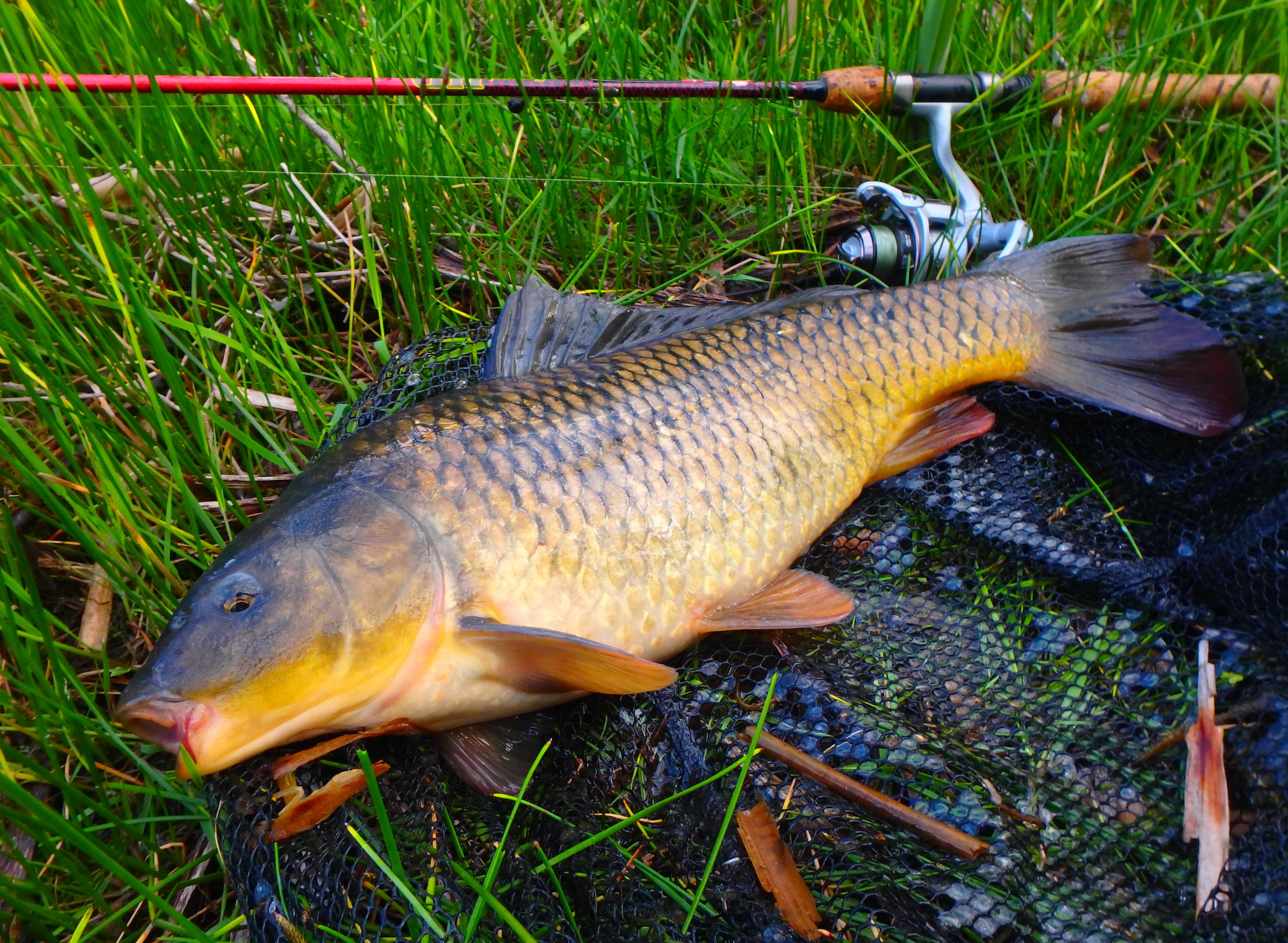 Jeg fodrede lidt med et par håndfulde majs, og fiskede ganske højt i vandret – cirka 30 centimeter under den vind-urolige søoverflade. 10 minutter senere røg det ene flåd under med fuld kraft, og jeg fik kroget en god og hårdt fightende skælkarpe. Mine “karpe-stænger” (Cherrywood 7″ / 2-7 gram) er ganske vist billige (se evt. MIT U.L.-GEAR), men har virkeligt ryggrad! – Derfor havde jeg god kontrol over fisken, som dog forsøgte sig med nogle meget lange udløb 🙂 – Inden nettet kom under den 60-65 centimeter lange lømmel, slap krogen dog pludseligt, og den trætte fyr daskede stille ned i dybet igen… Aaaaaargh!! 😦