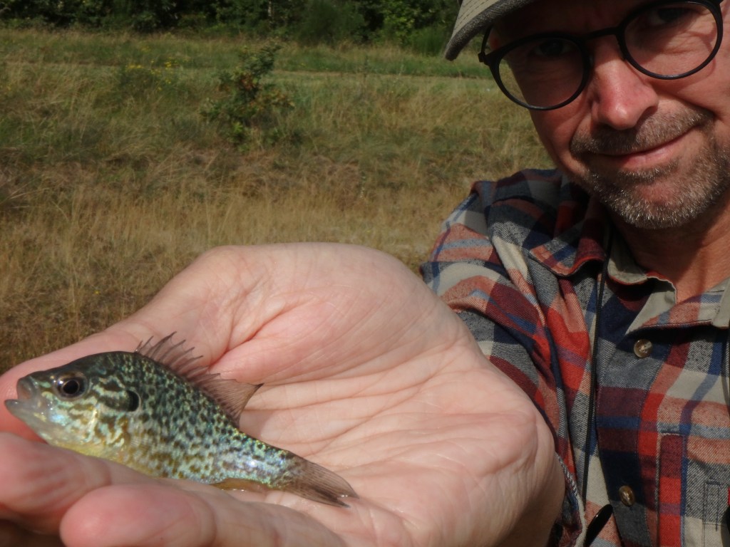 Nå, så stod der jo også Solaborre på sedlen. En art som er ret nem at finde i put & take-søerne, hvor de udsættes for at holde skidt og kravl som angriber ørrederne nede. – Til gengæld er den ikke nem at finde i guds frie natur, men et lille hint i en facebooktråd for en uge siden, skulle lige efterprøves. – Og den var god nok – solaborren lever nu vildt i det midtjyske! – Og der var mange!. Derfor kunne jeg hurtigt ekspedere 3 af de invasive, men meget smukke “malerier” i spanden 🙂