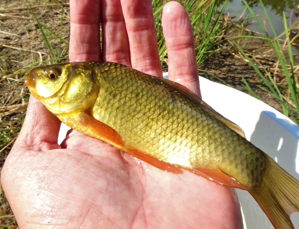 Efterfølgende var jeg et par andre midtjyske “bikse”, og i den første var der “personlig betjening” i form af et nyt bekendtskab – den dygtige ny-arts-fisker Søren. Jeg havde skrevet lidt med ham, og han mente at vi godt kunne finde nogle lokale Guldfisk (aka Sølvkarusse aka Guldkarusse). “Butikken” blev åbnet, men der var tilsyneladende udsolgt af farven orange, for efter et par timer var der kun den ufarvede variant af Sølvkarusse i spanden… – Samme problem i den næste sø, – her fangede jeg vel i alt 30 ufarvede (meget hurtigt i øvrigt), men stadig ingen orange eksemplarer. Jeg så dog den farvede udgave i begge søer, men de ville ikke hugge tilsyneladende. – De ufarvede er ikke specielt tydelige i en havedam, så de fik alle friheden igen. I den sidste sø sluttede jeg af med et par flotte ægte Karusser, – den største fik jeg lige et snapshot af: