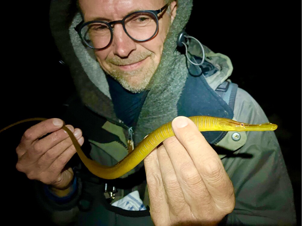 Det er så vidt vides kun tredje gang denne art er landet på stang. – De to foregående var af hhv Martin og Mark, som pudsigt nok var med ude med vinduerne denne aften 🙂 – Snippen målte i øvrigt 48,7 cm, og var en art jeg ikke just havde kalkuleret med i min jagt på 100 danske UL-arter (pt nu 94). Og så har den forresten et monster sejt engelsk navn: “Snake Pipefish”…. – cool navn, ikk’? 🙂