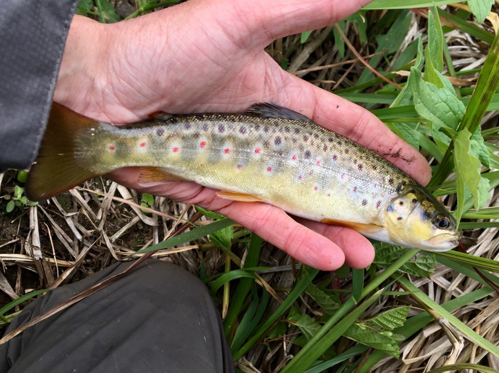 Havørrederne så vi intet til, – men Peter fik også en regnbue (34 cm), mens 5 af de 8 mand havde små fine bækørreder på land. – Så lidt riv i linerne var der da. – Her en af de fine bakørreder som jeg fik et par håndfulde af: