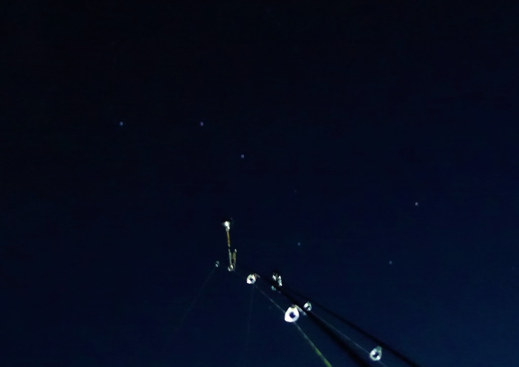 Ænder tumlede rundt over mine liner for at finde ro for natten, mens flagermusene også ramte linerne – og derved aktiverede mine åleklokker – så jeg var på stikkerne hele tiden…. 🙂
