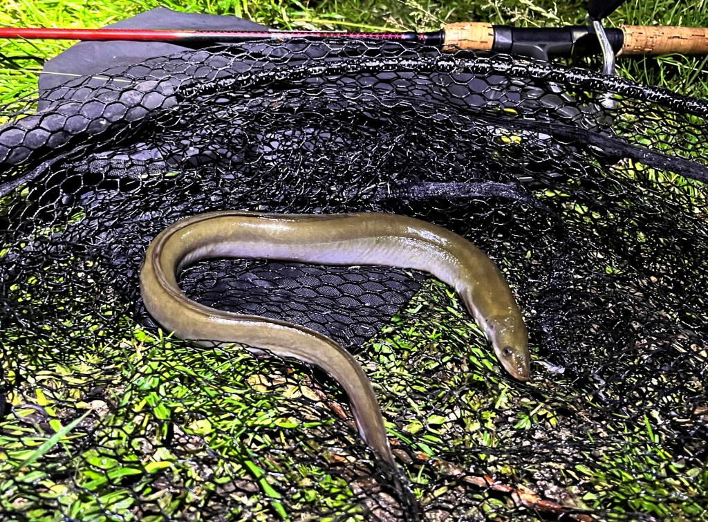Og så skete det sgu! – Et godt vip i venstre stang blev besvaret med et modhug, og der var spræl i den anden ende. – Hurtigt stod det klart at det ikke var en bette Aborre eller en Skalle. – Og ind i nettet kunne jeg dirigere – tadaaaa – EN ÅL! 🙂 🙂 🙂