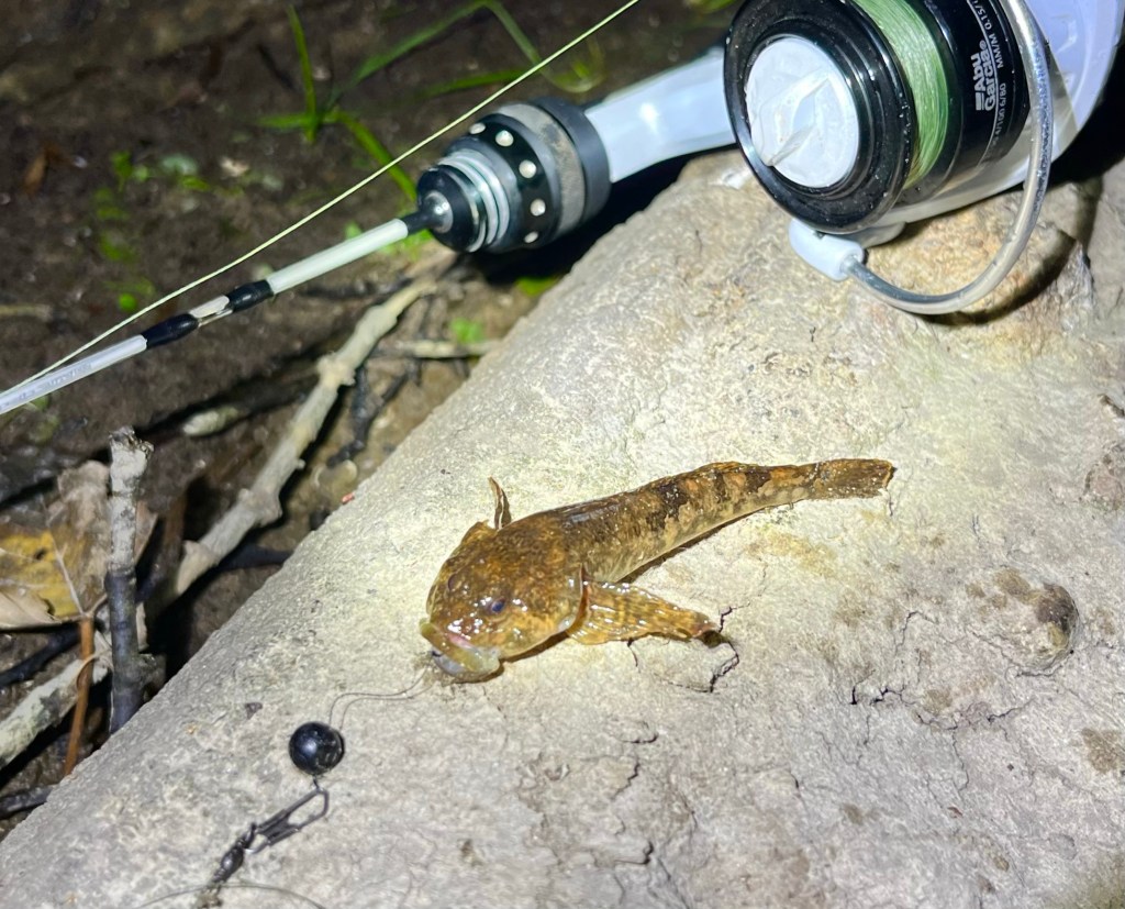 Jeg spottede snart et eksemplar af targetarten, og kort tid efter kunne jeg melde “mission accomplished”, for den lille fisk huggede uden tøven 🙂 – Og størrelsesmæssigt var den ganske fin af sin art: 7,4 cm (hvor de oftest ligger på 5-6 cm). 3-4 munitter senere spottede jeg endnu éen, som dog stak af, og hurtigt så jeg en lille fyr ved i et strømlæ. – Den fik lov at slippe for at blive belemret af mig.