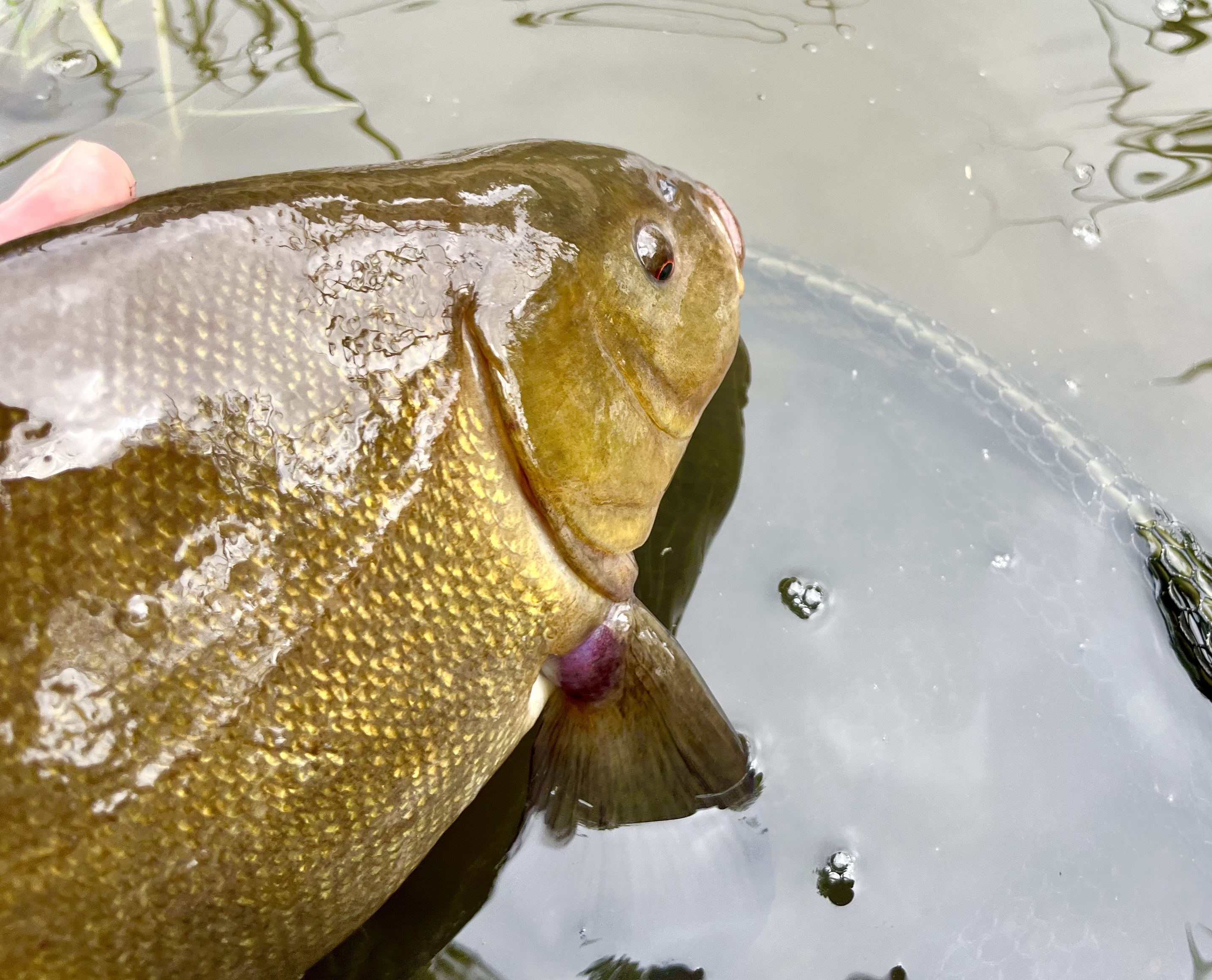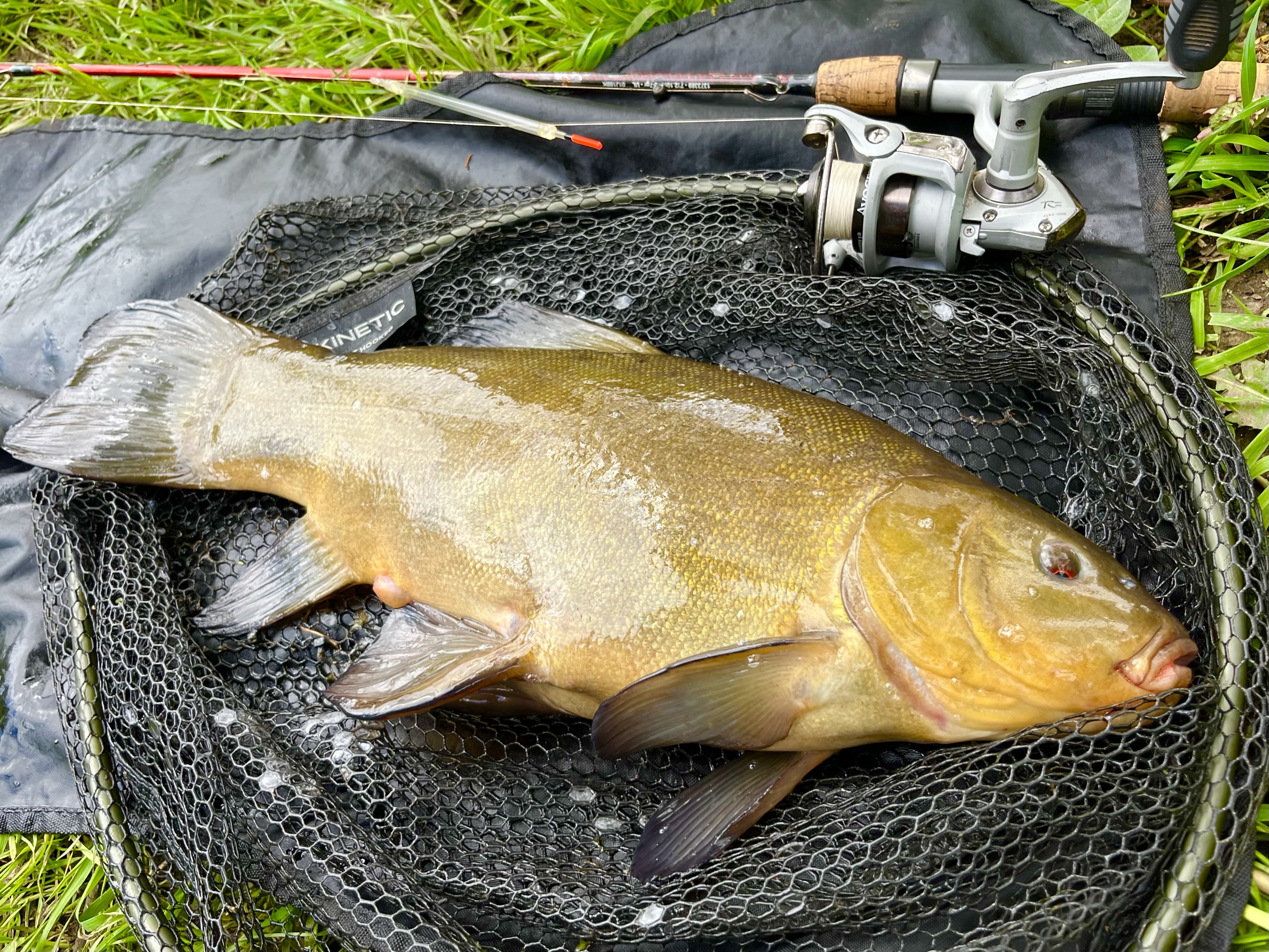 Jo, – det var det åbenbart. – Der kom efter en halv times venten et par små boble-skyer ved siden af mit flåd, – som kort efter løftede sig! – Et modhug efterlod ingen tvivl om, at der var guld for enden af linen. – En stærk fisk der virkeligt kunne presse den spinkle 7 fods UL-medeklinge, som dog alligevel var stærk nok til at dirigere den flotte hun-suder sikkert i nettet 🙂