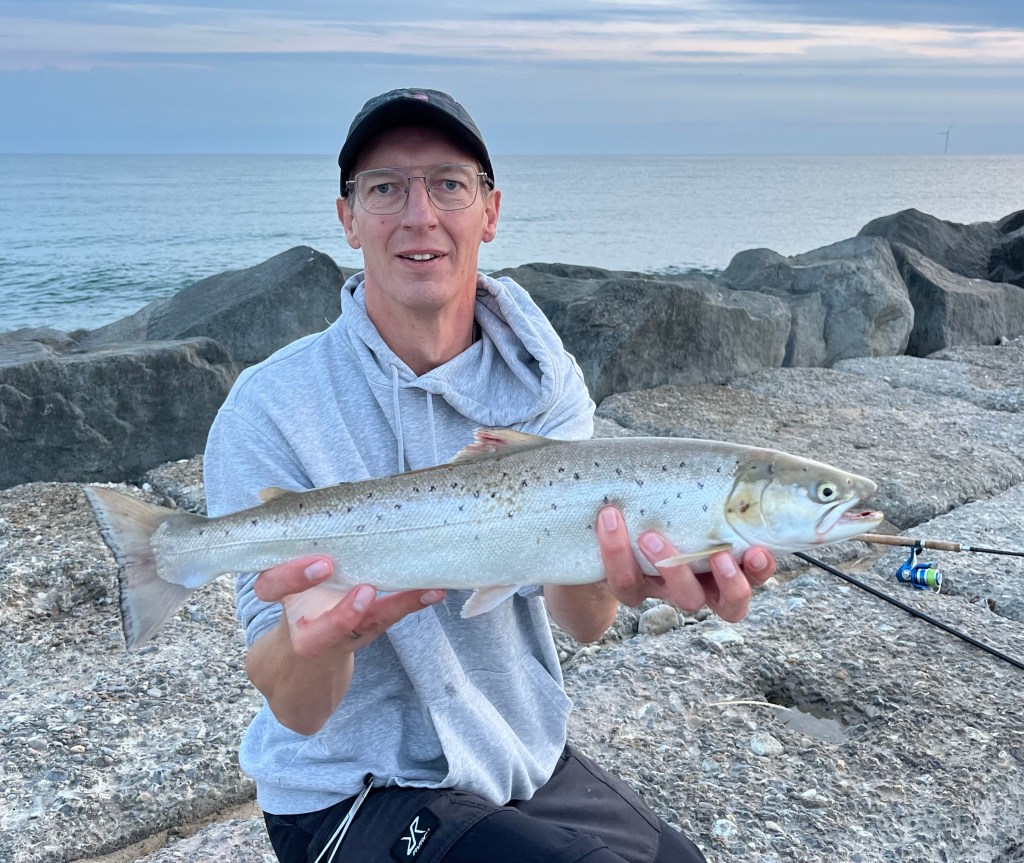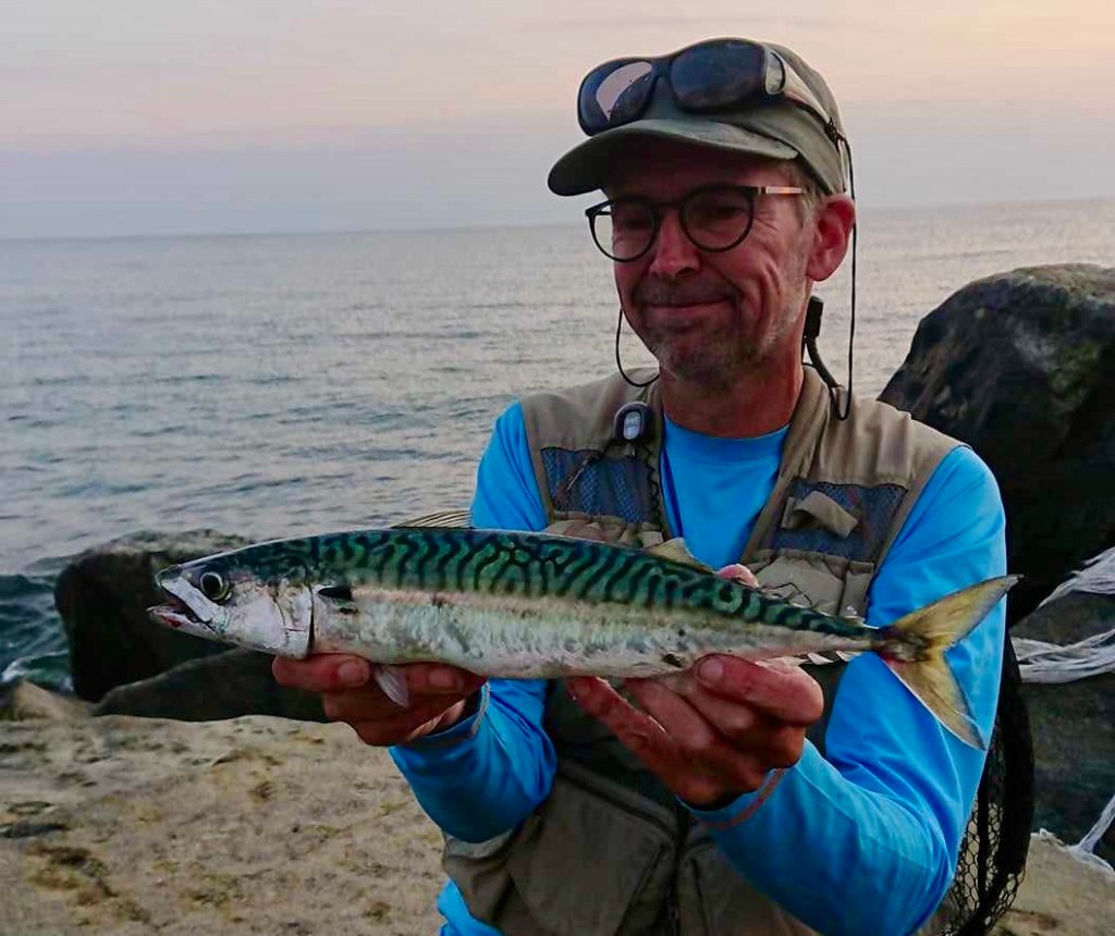 Imellem makrellerne lurede også de mere intereassante fisk, og det udnyttede min dygtige makker til fulde. – Først grovfightede han en stærk havbars på 47 centimeter i nettet, – en maks lækker sag, som det fremgår af topbilledet. – Denne art er altså bare – imo – den absolut fedeste danske art! – Og sandelig om Peter ikke snart igen stod med fisk på – som tydeligvis ikke var hverken makrel eller hornfisk!. – Vi var lidt i tvivl indtil en blank havørredside viste sig i overfladen. – Og snart lå den i nettet 🙂