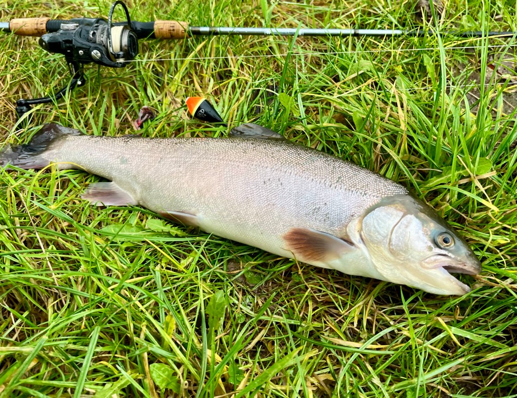 Med en snap fisk på land kom der ro på i den næste halve time, og kaffetørsten meldte sig. Derfor blev den orme-monterede flådstang aktiveret, og det gav snart bonus! – Flåddet dykkede og modhugget blev sat. Endnu engang var der ganske OK riv i den anden ende, men snart var ørred nummer to sikkert parkeret i nettet. Denne gang en super blank Sølvørred, – en virkeligt smuk fisk. Meeeen den var så også allerede års-noteret (Læs evt. SØLVET FUNDET).