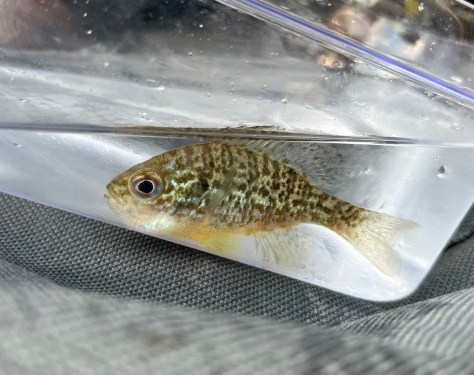 Jeg stoppede ved en midtjysk sø på vejen til det sydjyske, og hurtigt var der bud efter den tanagokrog som agnet med regnorm daskede under mit mikroflåd. En fint møstret Solaborre på omkring de 8 centimeter huggede og røg i feltakvariet: