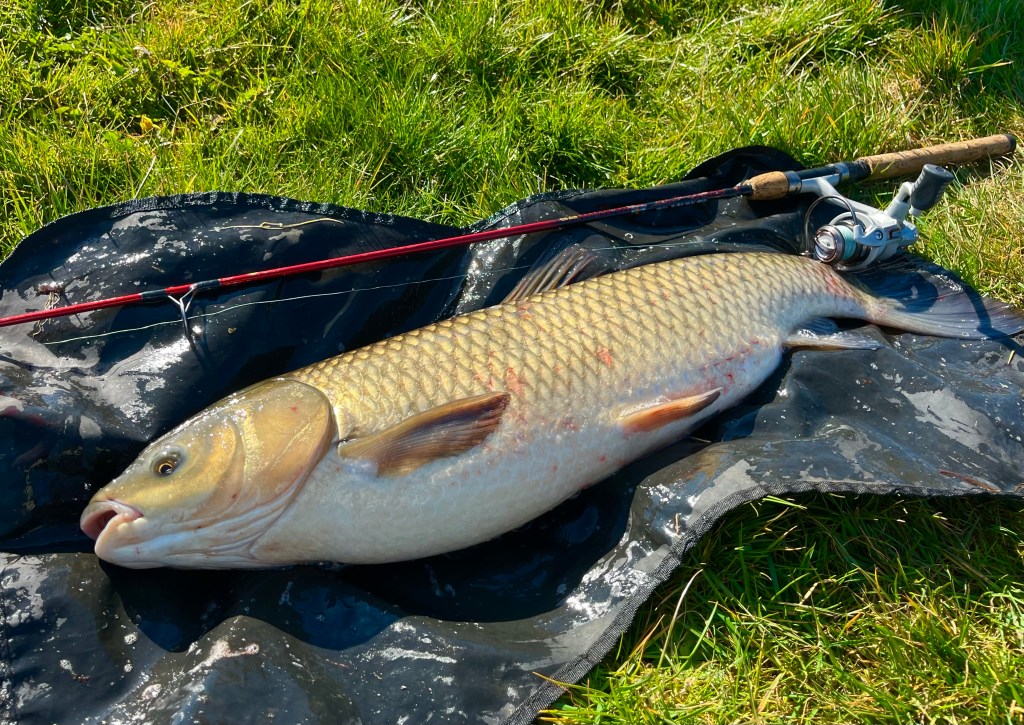 Det var en stor Græskarpe som havde guffet mit majskorn agnet på en spinkel lille størrelse 12’er krog, og UL-pinden fleksede kraftigt, mens mini-hjulet måtte aflevere en god del af den begrænsede mængde line. – Lækker fight – lækkert adrenalin-rush!!