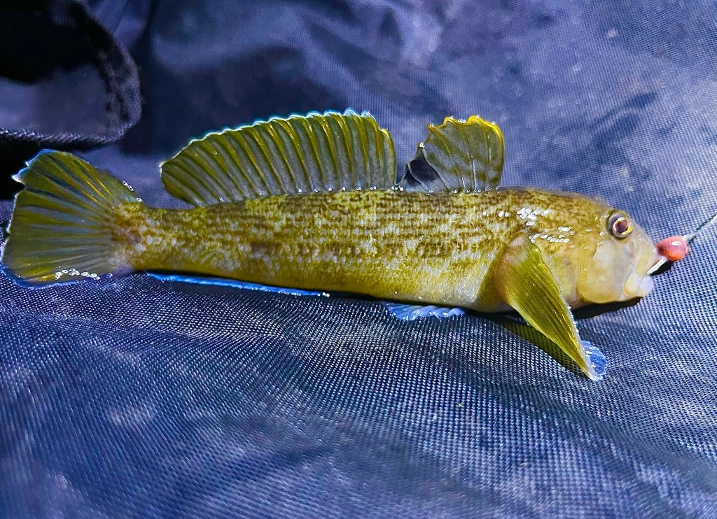 Inden mørket faldt på, kunne jeg lige nå en tur ud i Fjorden efter turens sidste target-art, – den Sortmundede Kutling. En invasiv og upopulær art som efterhånden har bredt sig fra det sjællandske og helt op til det østjyske. Jeg riggede et let bundforfang til med regnorm, og efter 10 minutters fiskeri fik jeg hvad jeg kom efter, – og faktisk mere til, da drønnerten med sine 14,2 centimeter var ny PR. Og med den størrelse må det desværre konstateres, at den art lever i bedste velgående i det østjyske….