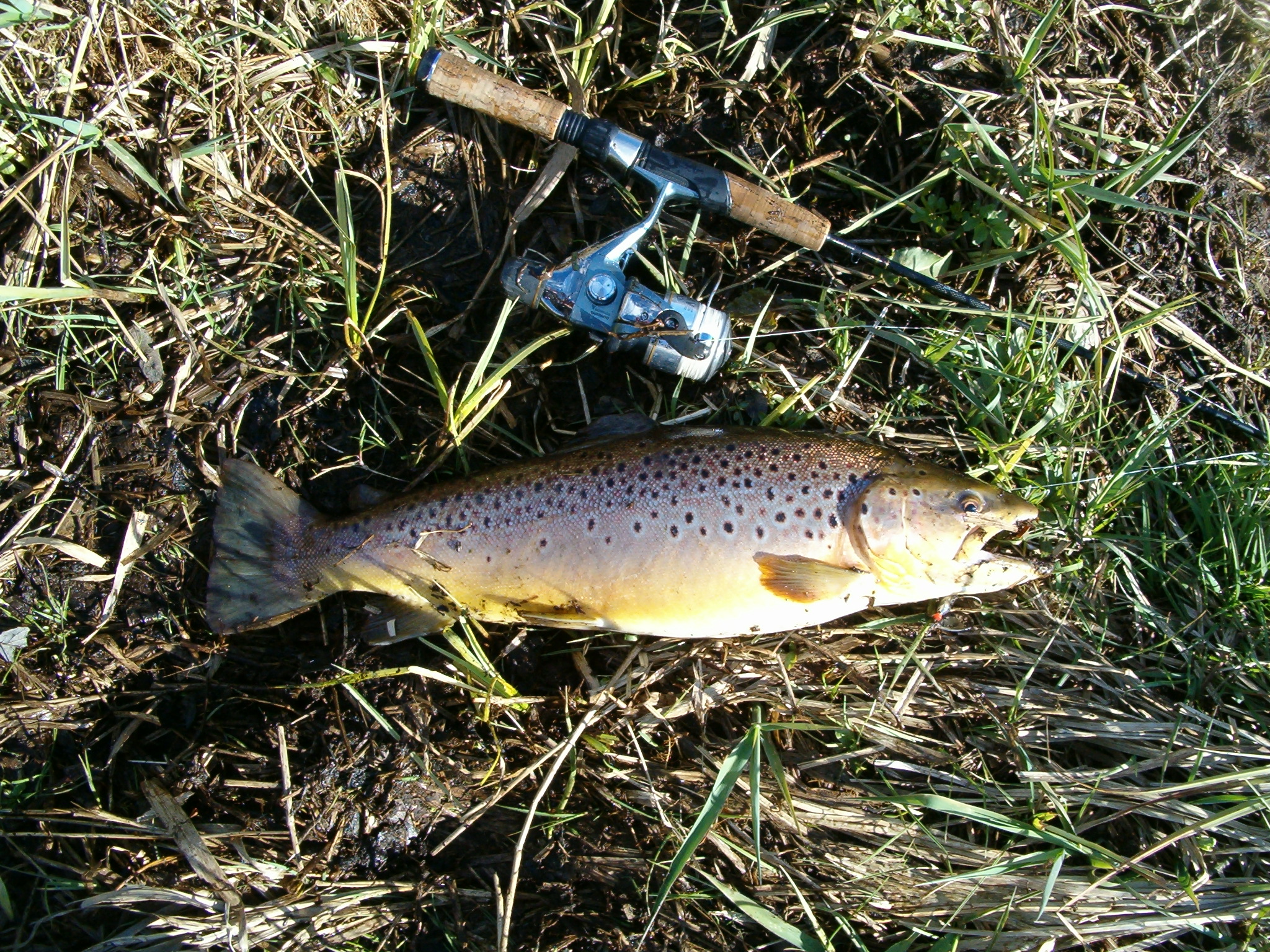 ♦ Næste kast var noget mere kontrolleret og landede ungefär som planlagt, og et par sekunder efter var der hug fra en godt fightende bækørred. – Efter en kort – men yderst intens og underholdende fight, hvor jeg virkeligt kunne mærke fiskens “moves” langt op i armen, – var det lidt overraskende, at den – i øvrigt ganske kønne bækørred – viste sig at være under 30 cm. – Og så gik det jo op for den landlevende part af fighten, at den sensitive fight-fornemmelse røg i top på grund af det lille multi-fleksible og spinkle “sugerør” som nu lå i græsset.